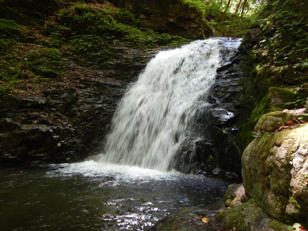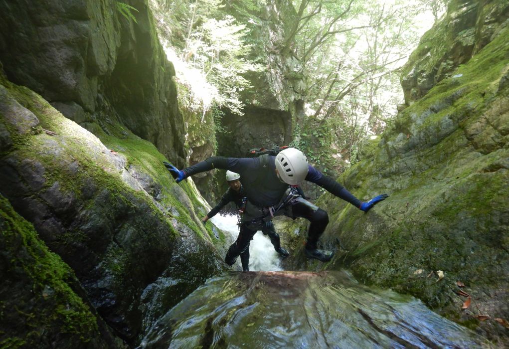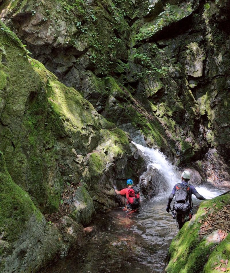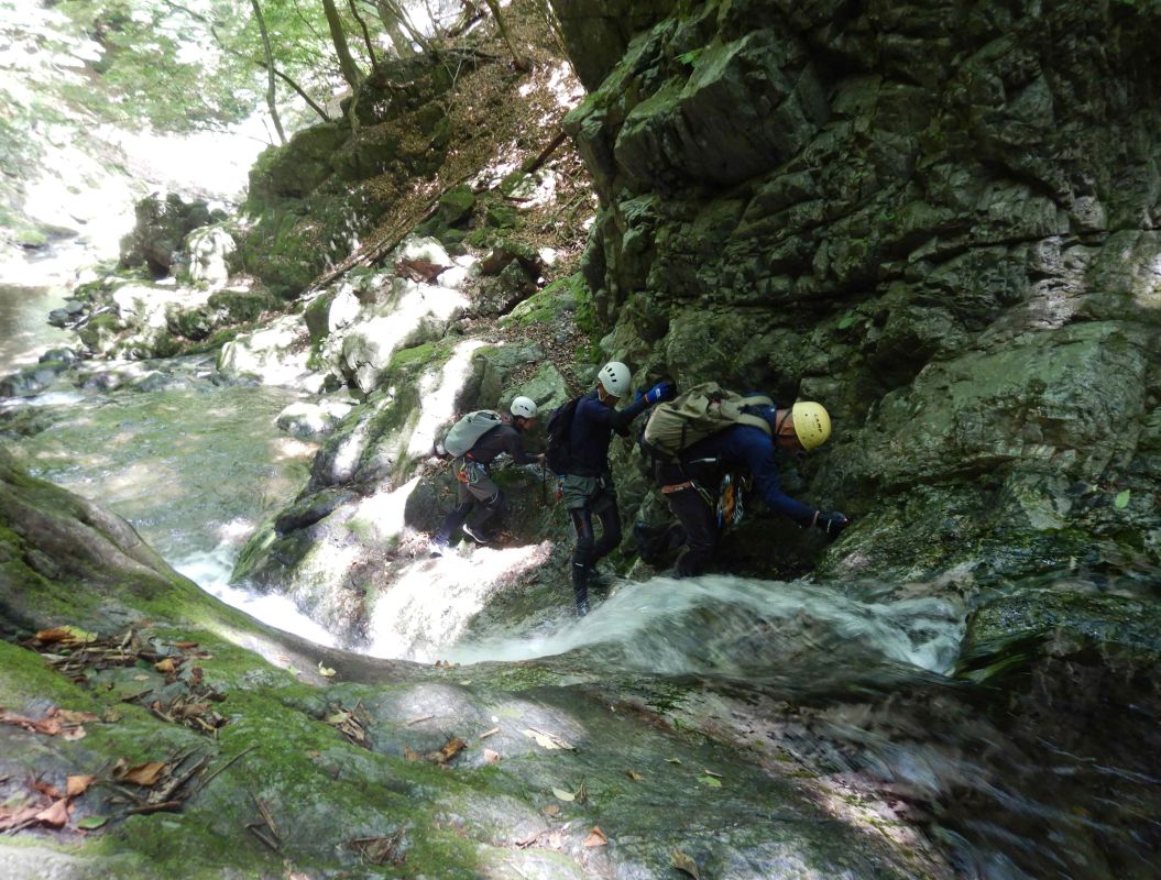 ヌメリがひどく滝の登攀は難しいという主旨のヤマレコが多いが、フエルト靴のフリクションがよく効いて問題なかった。タワシも使用せず。猛暑だというのに水はとても冷たく、盛夏の遡行がおススメ。
