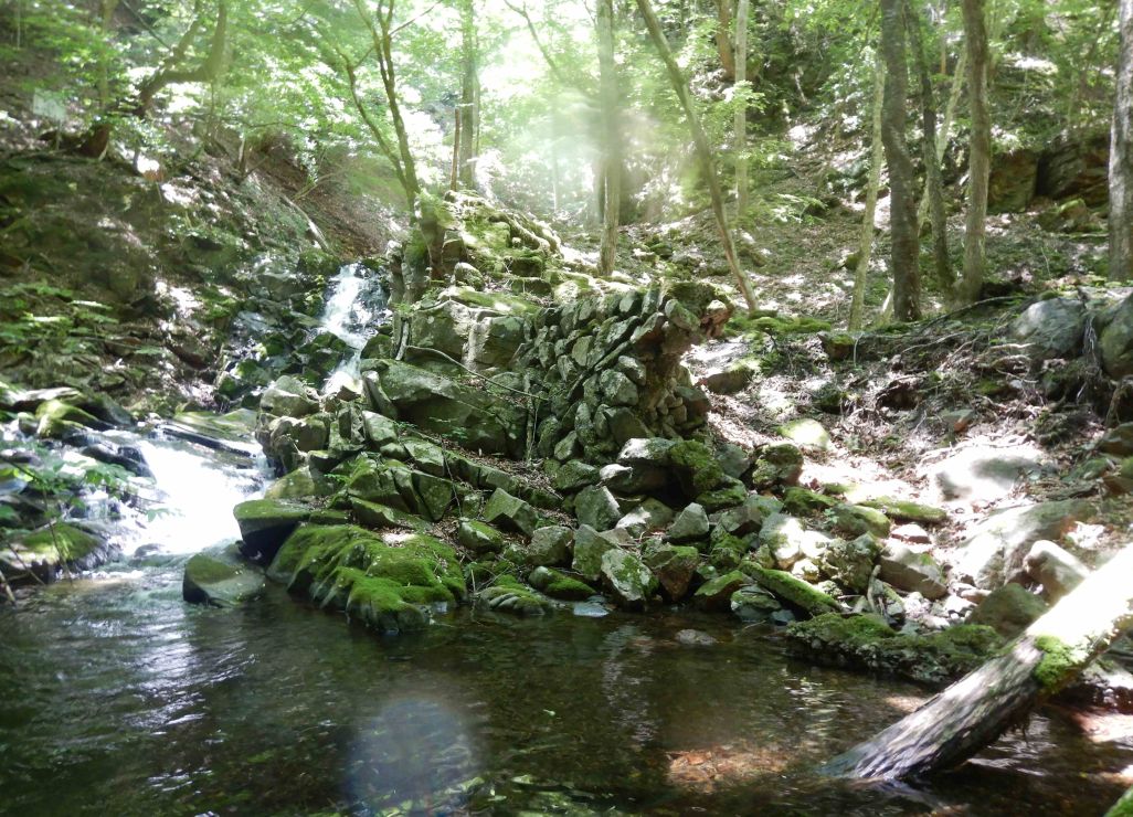 しばらく遡行すると崩壊気味の石垣が現れ造林小屋跡地であることがわかる。