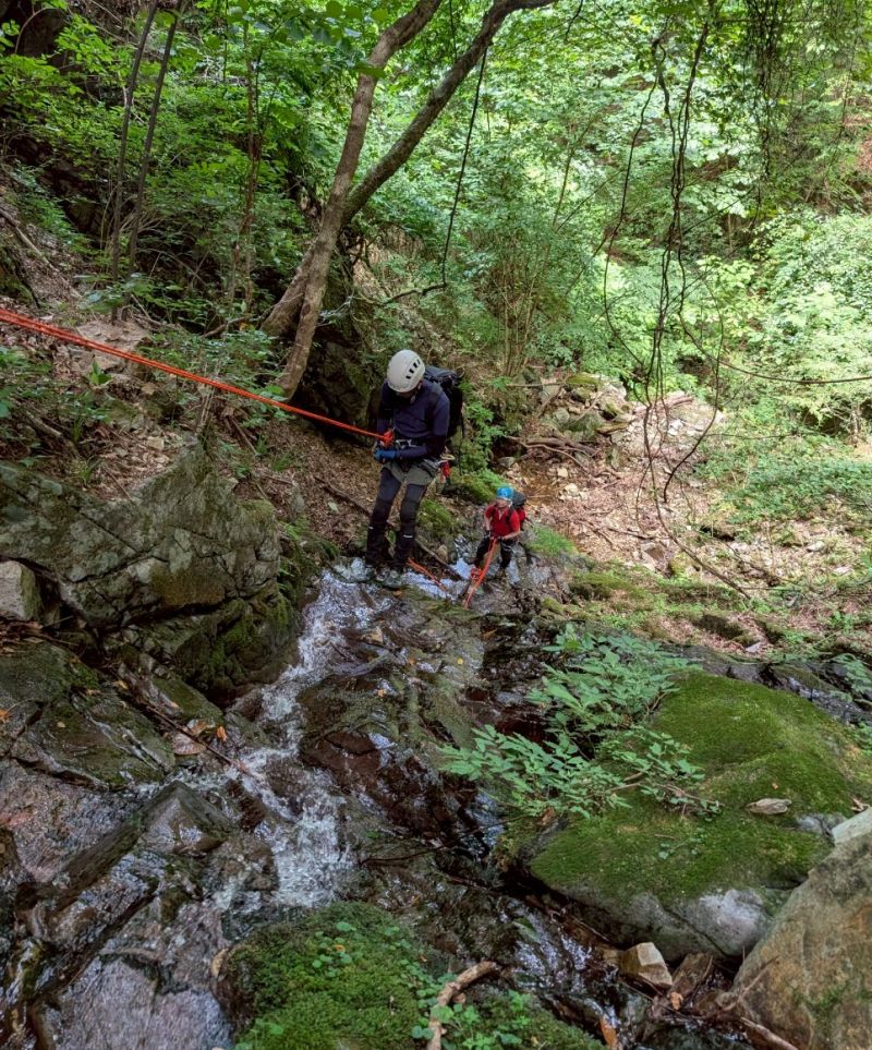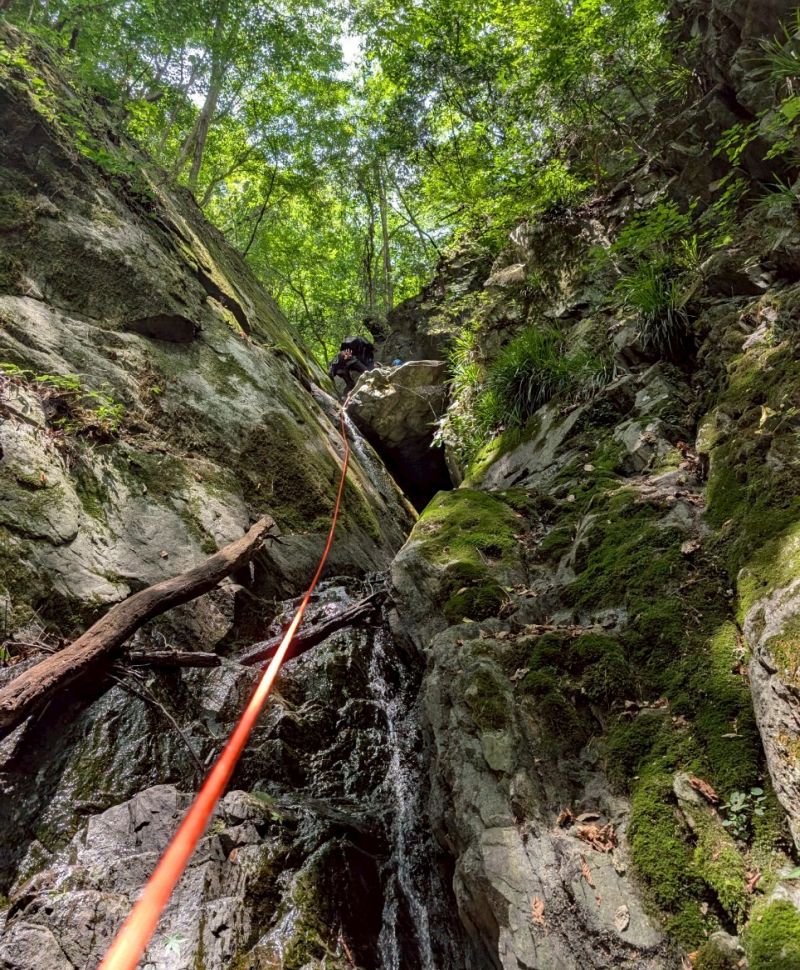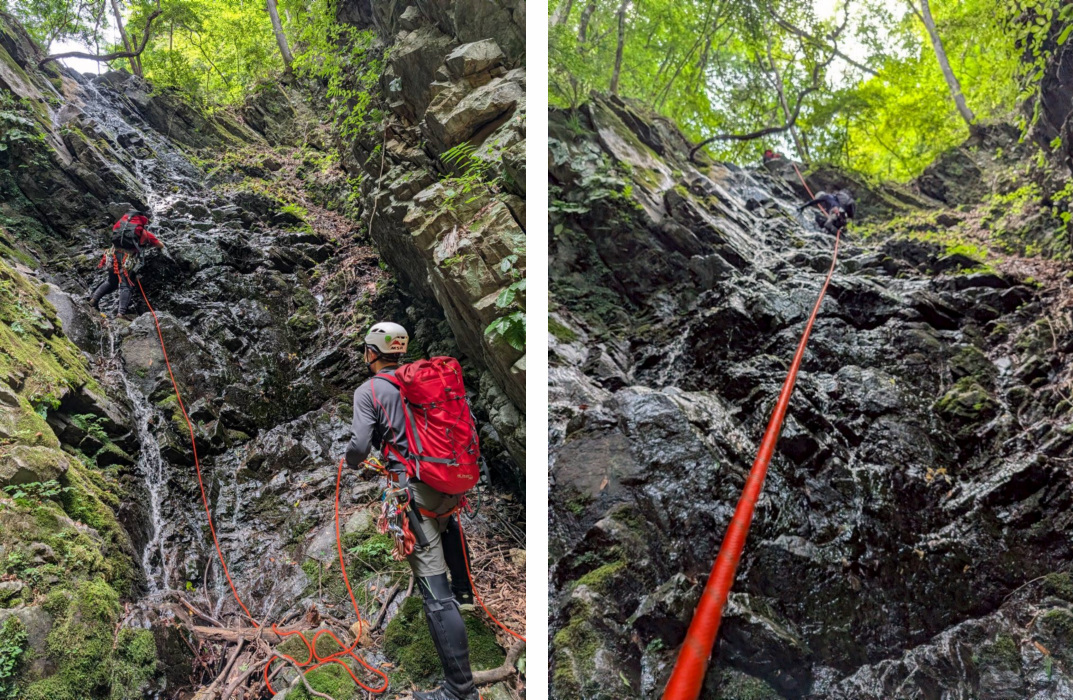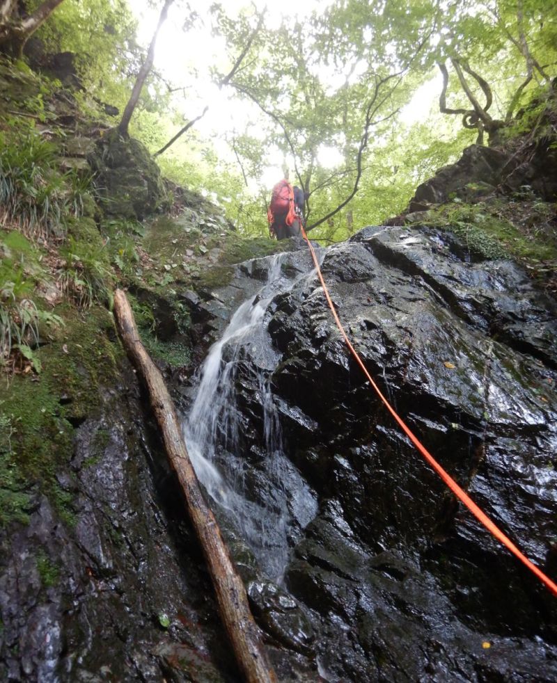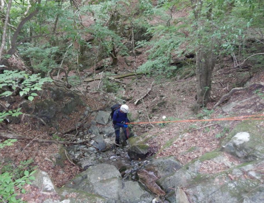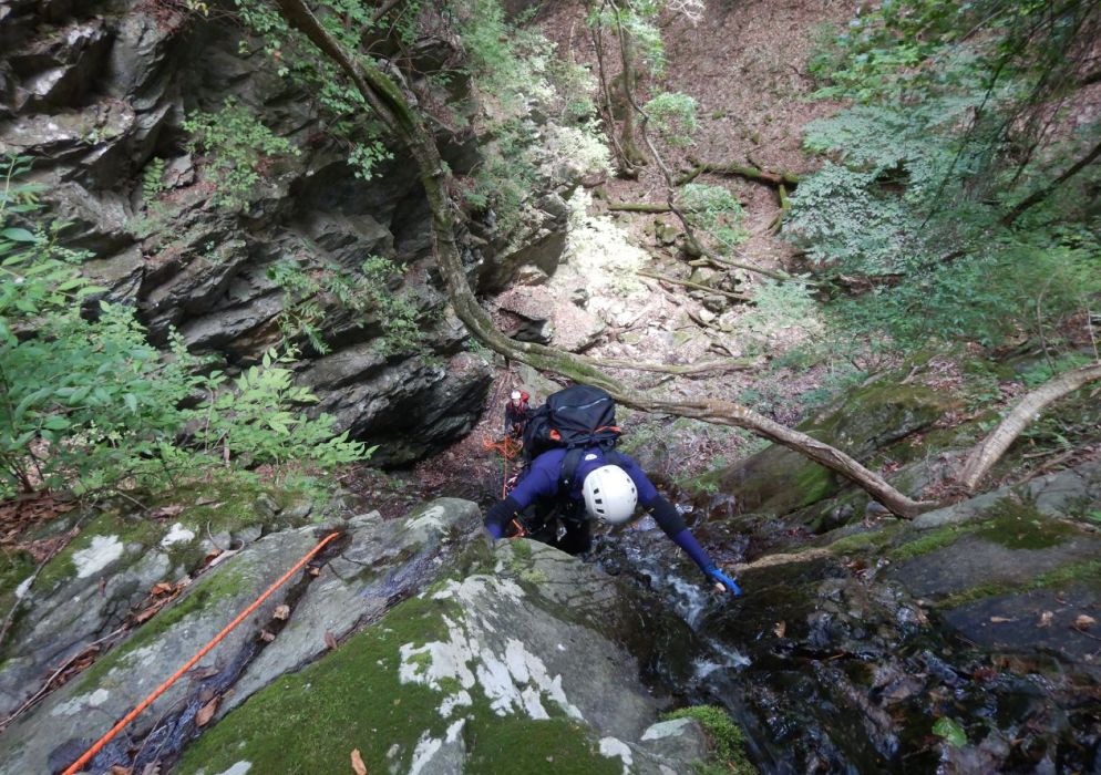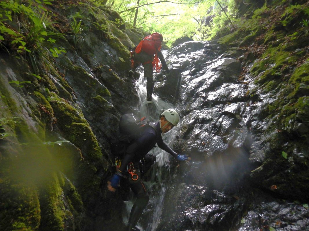 滝の落差は小さくても支点となる樹木が遠い個所はダブルロープで対応。あらかじめ想定して2本用意したのは正解だった。ほどなく右俣本流に合流し最初の3×4m滝をクライムダウン。
