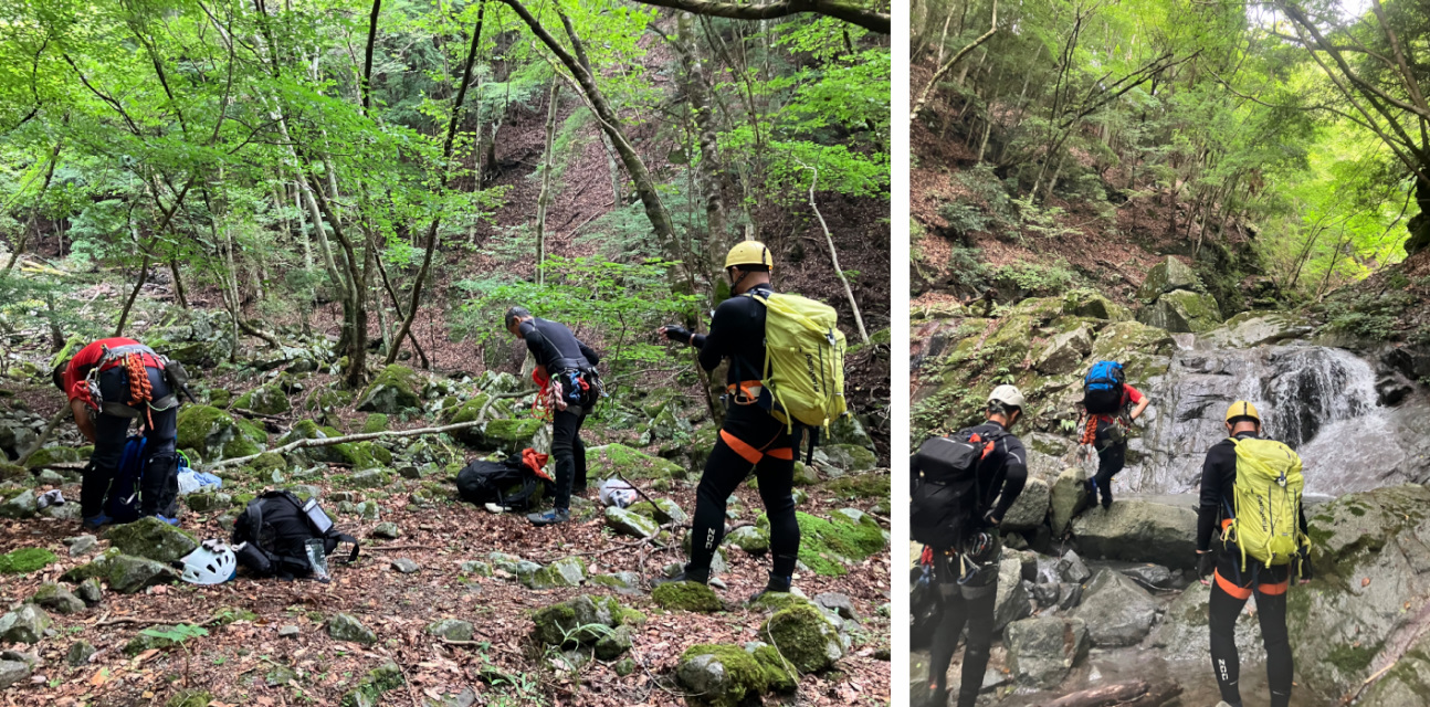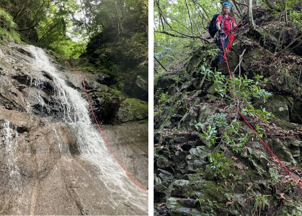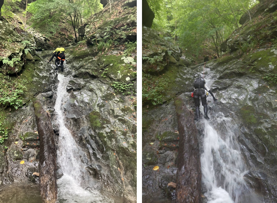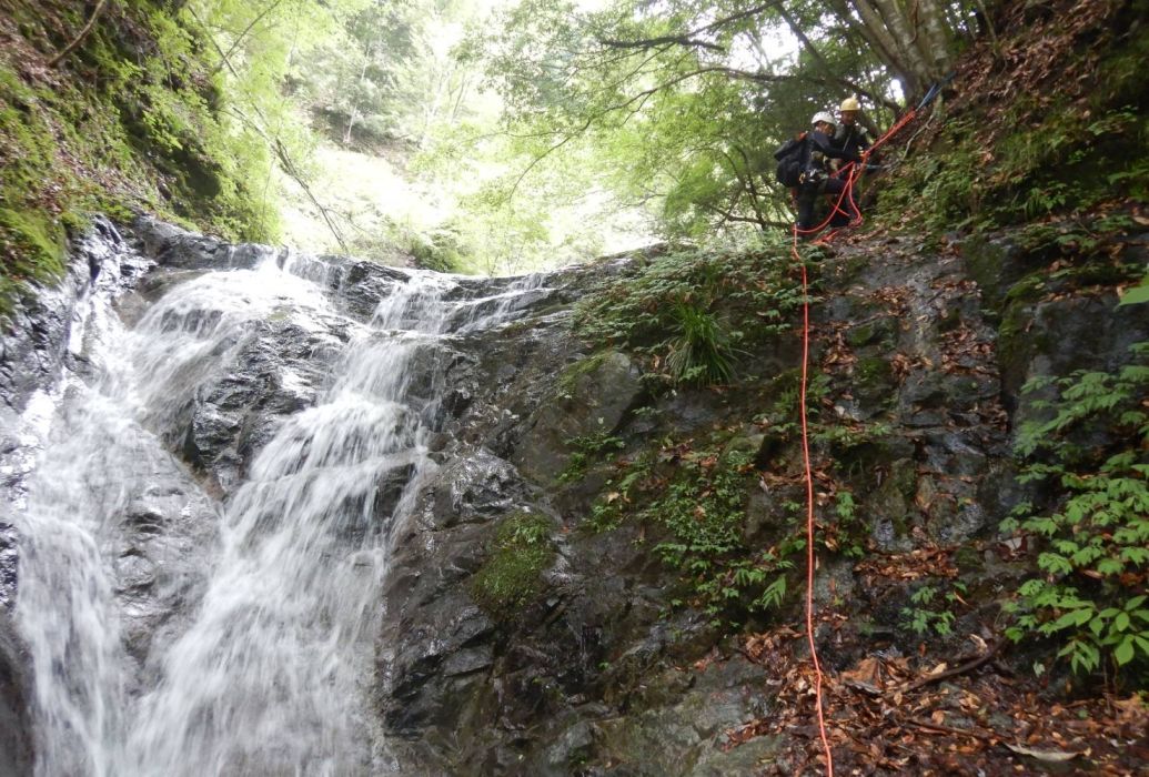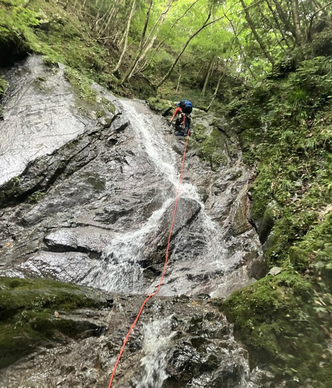 今回は滝ごとに、どのように登るのが良いかを相談しながら進むことになった。また、ロープワークの練習を兼ねて、積極的にロープを出していただく。