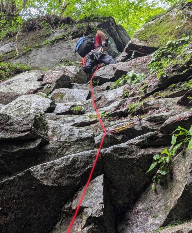 最後の10m枯れ棚も高橋さんがリード。3箇所の中間支点のうち1つにカムを使用。4年前に購入したものの今まで一度も使う機会が無かったとのこと。適切なアドバイスをいただき、安全に登ることができて安堵した。