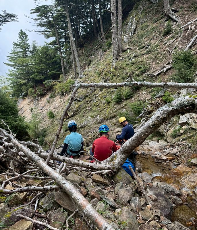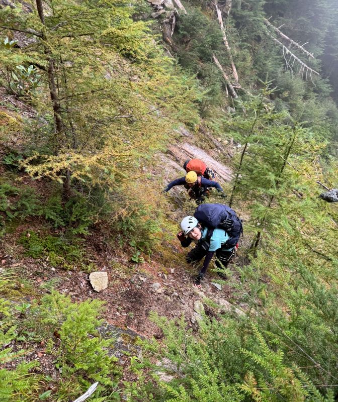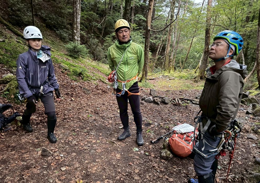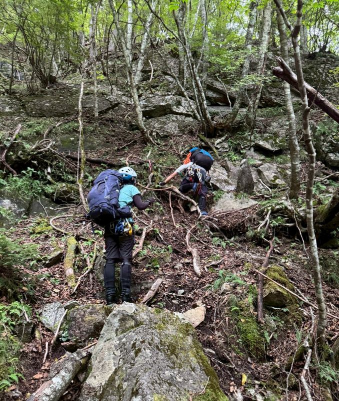 魚留の滝横から巻きますが、ここで初めてロープ補助の決断をした。高橋さんがビレイをすべく最初に登った。