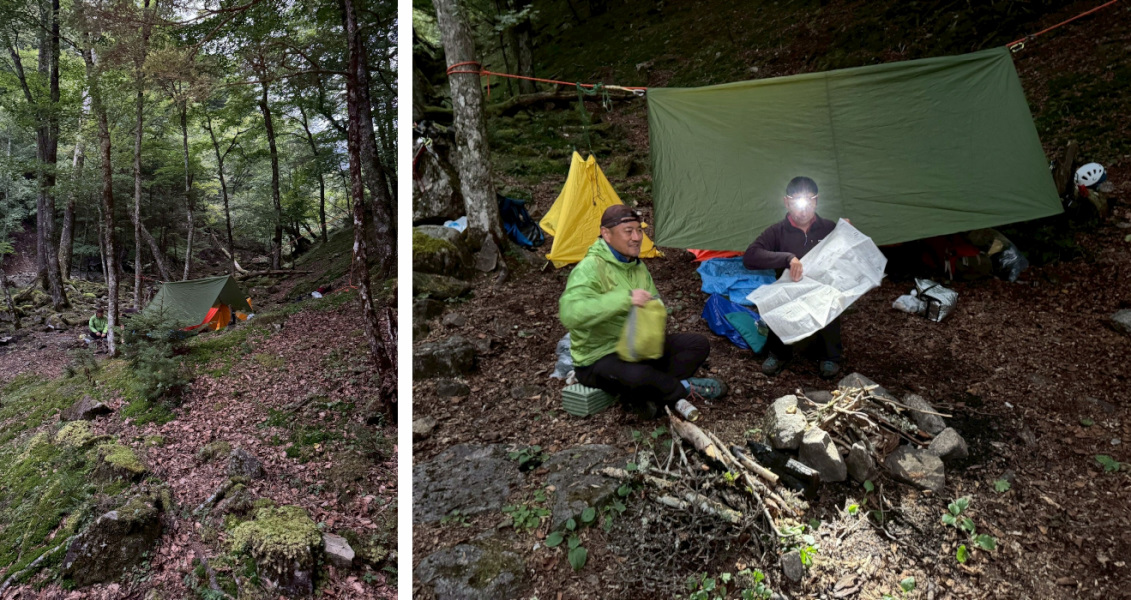 急登を登り終え1610m地点ですぐに野営適地を見つけた。周辺には焚火跡が多数存在した。この時点で16時をまわっていた。