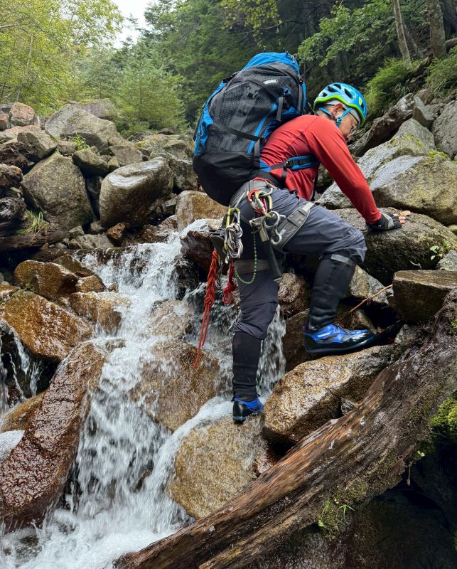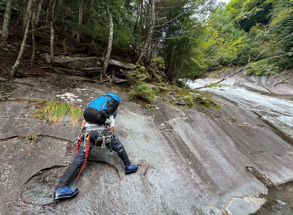 東のナメ沢を越えてすぐのスラブ。とても滑りやすく私(齊藤)と堀越さんが水に落ちました。水はキンキンに冷たく、この先どうやって水に入らずに進めるかなど頭をめぐっていました。