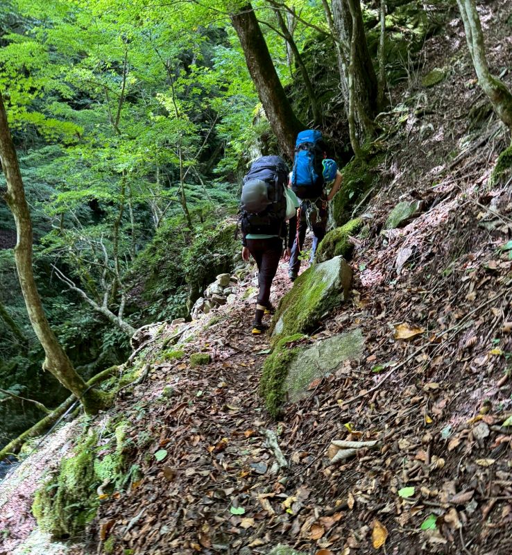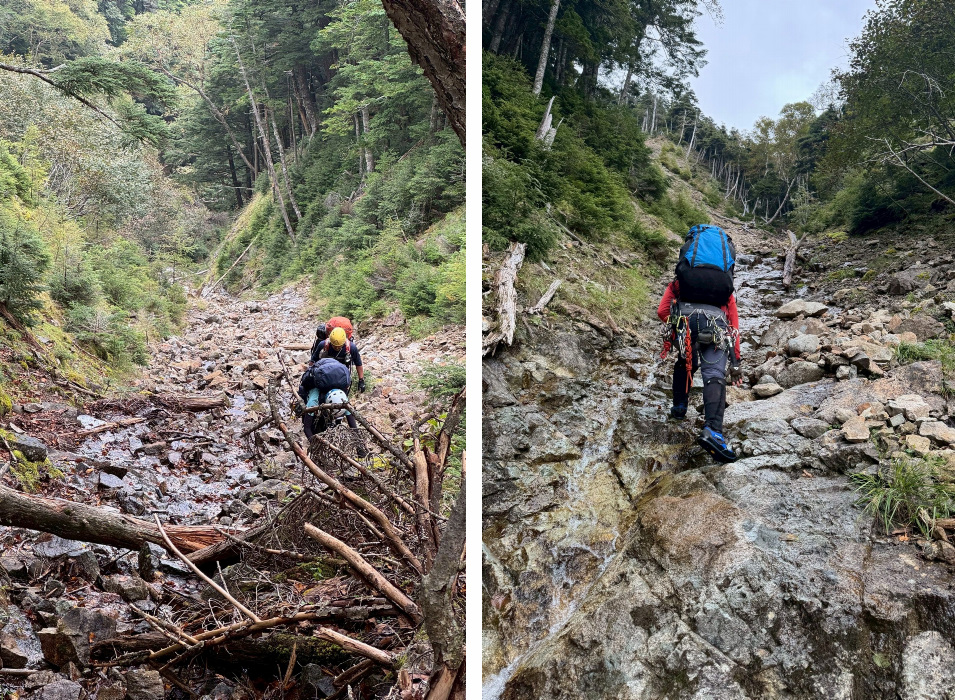 鶏冠谷出合を越えて巻道を進みます。途中ところどころ崖上の崩れかけた道があり、滑落の緊張感が襲ってきました。