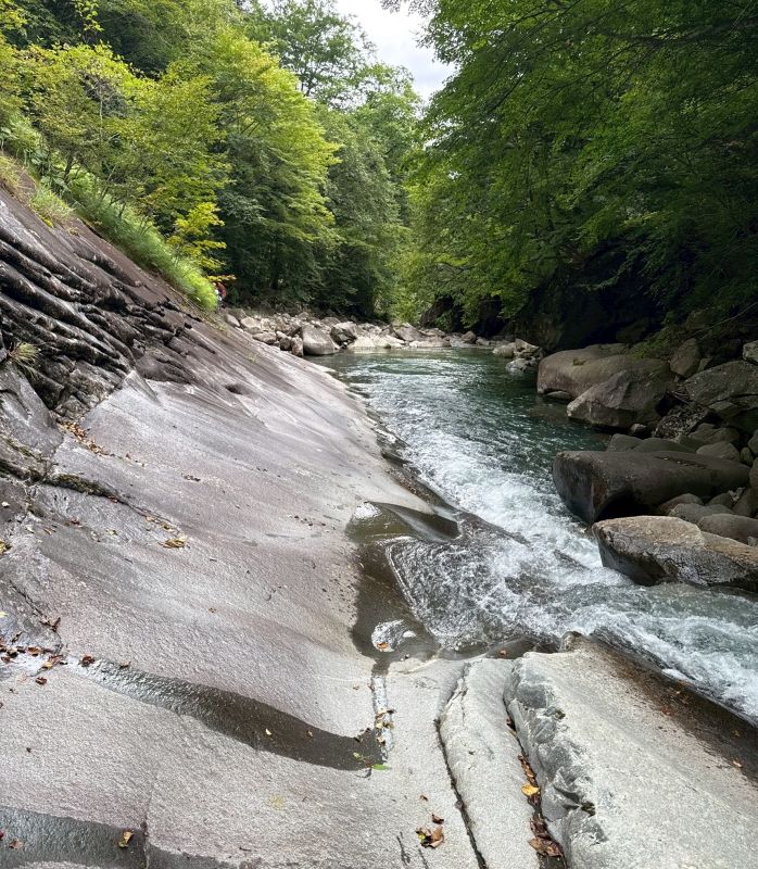 魚留の滝を登って少し行くと、名勝千畳のナメです。この景色で大感激、皆で写真を撮り合いました。