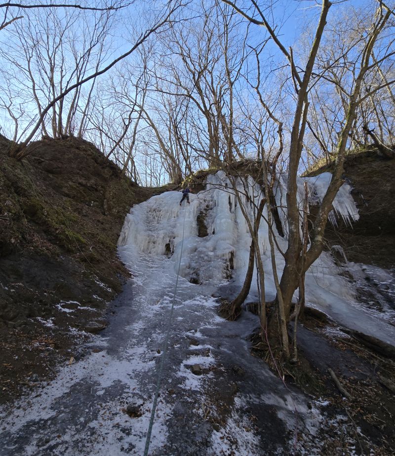 左の氷瀑に取り付きます。ここはリードは怖いので上からトップロープを張りました。右と左を登ったあと、疑似リードとスクリュー回収しながら登る練習。5回登ってパンプしてきたので終了。