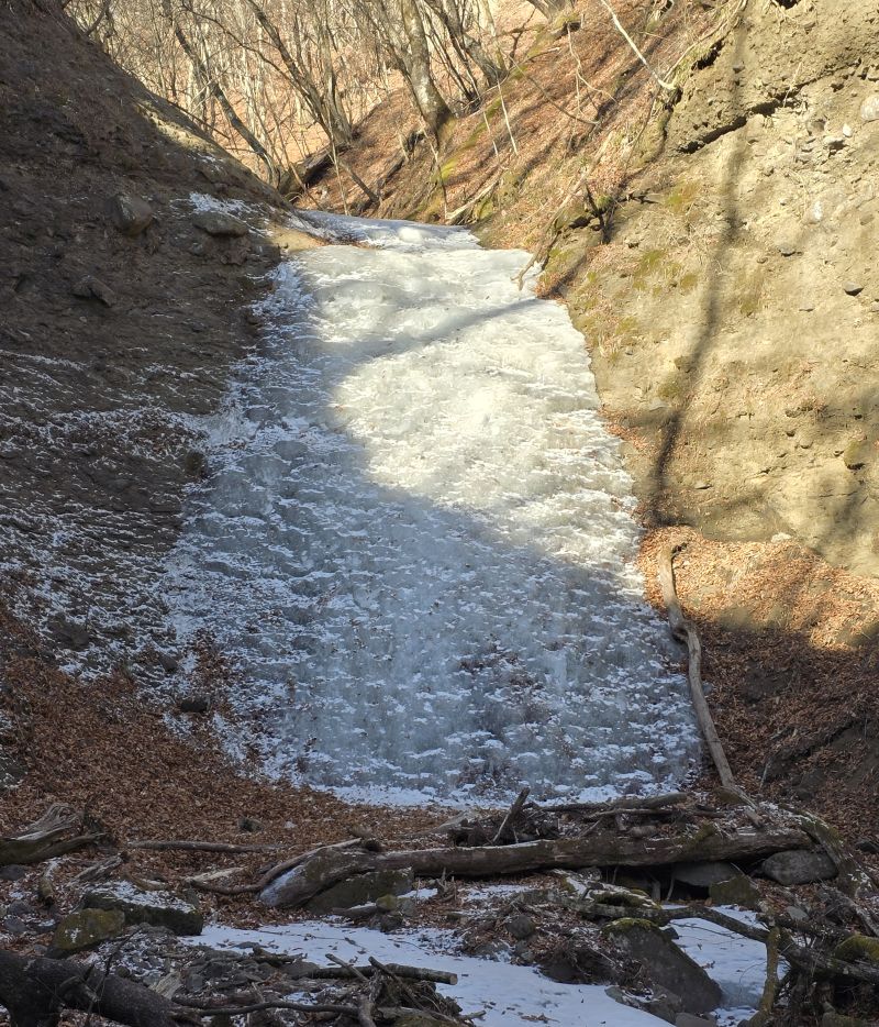 アプローチが短いと聞いていましたが、金湯館駐車場から5分ほどで到着! 山に雪はありませんが氷はしっかり着いています。至る所にフィックスロープや捨て縄があります。