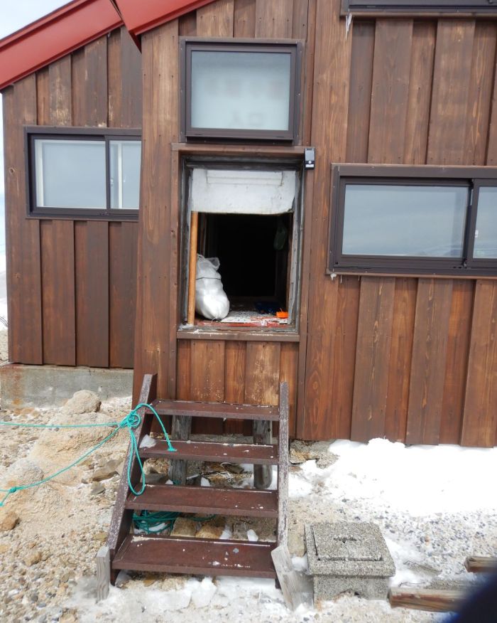 燕山荘冬季小屋に停滞を決める。天候が悪く、建物が複数ある中、冬季小屋をすぐに見つけ出すことができラッキー。入口に手を掛けてをみると、問題なく開いてほっとした。