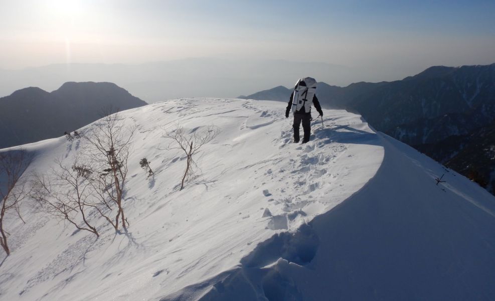 富士見ベンチ以降ラッセルとなる。合戦小屋から上はまばらな樹林の急斜面、しかもラッセル。トレースはなく、ピンクテープを丁寧に探しながら高度を上げていく。合戦沢の頭(昭文社山と高原地図では合戦ノ頭、2488.1m)から風が強まる。