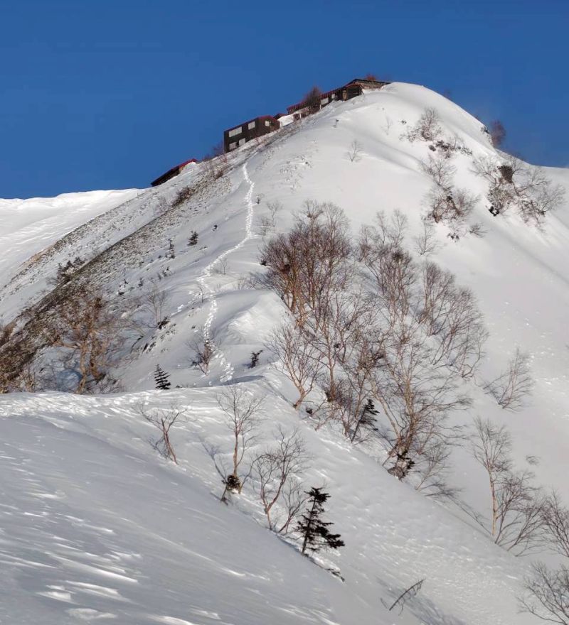 燕山荘は目前で、30分位で着くと思っていた。地上天気図によると函館付近に低気圧が位置しており、その影響で風は強まるばかり。時折、足を止めてやり過ごすほど。雪は二重の逆構造(メルトフリーズクラスト+弱層+メルトフリーズクラスト+弱層)で苦しいラッセルが続く。結果として3時間以上を要した。