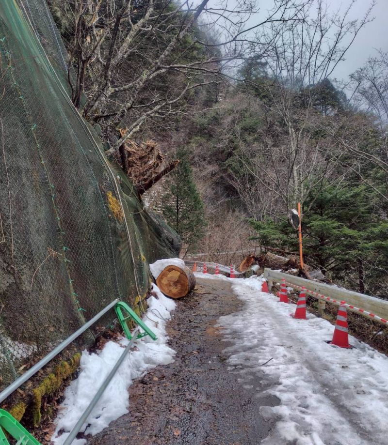 穂高駅でタクシーに乗車、宮城ゲートへ向かう。林道は冬季閉鎖のため、ゲートから中房温泉まで12kmの林道歩き。大木が崩壊している個所があり、春の開通に間に合うのか心配になる。